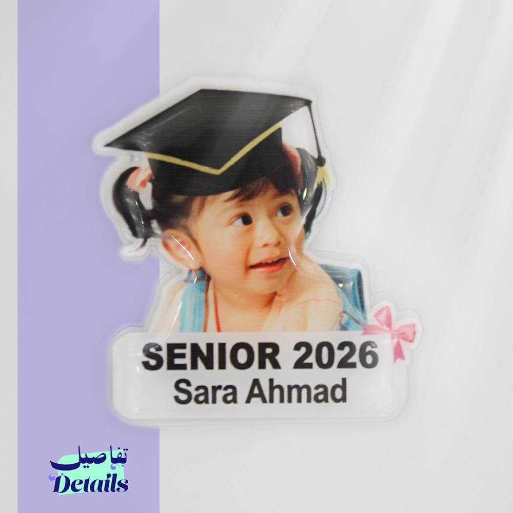 دبابيس تخرج من الأكريليك بطباعة ( الأسم + التاريخ + الصورة ) مثبت بالخلف